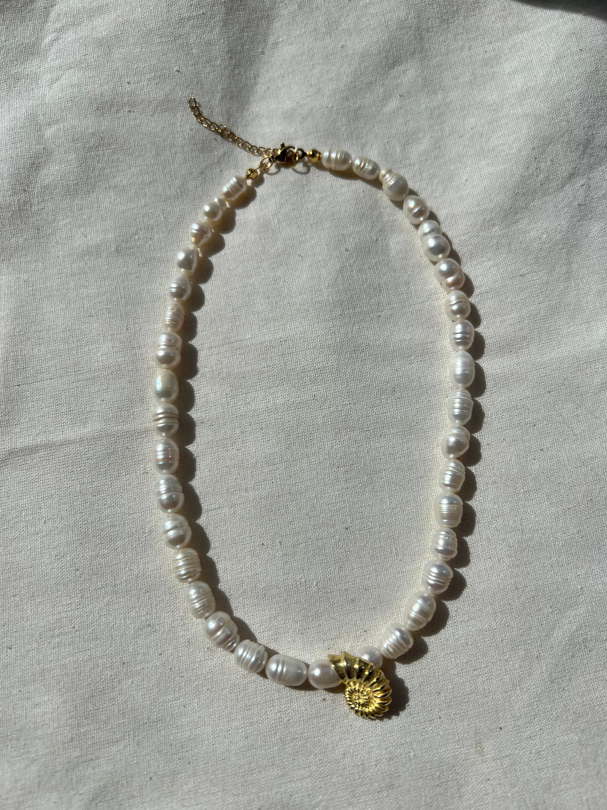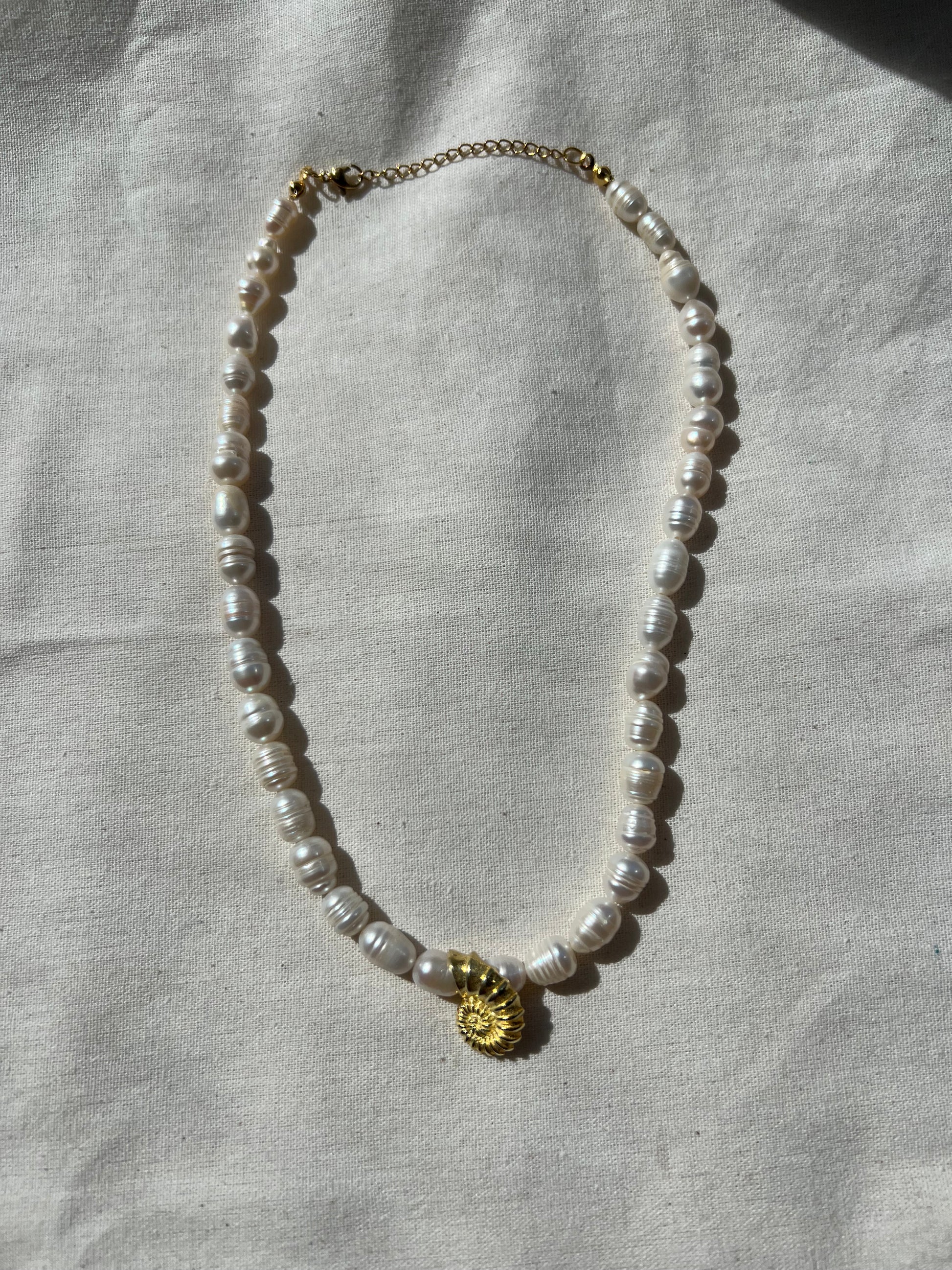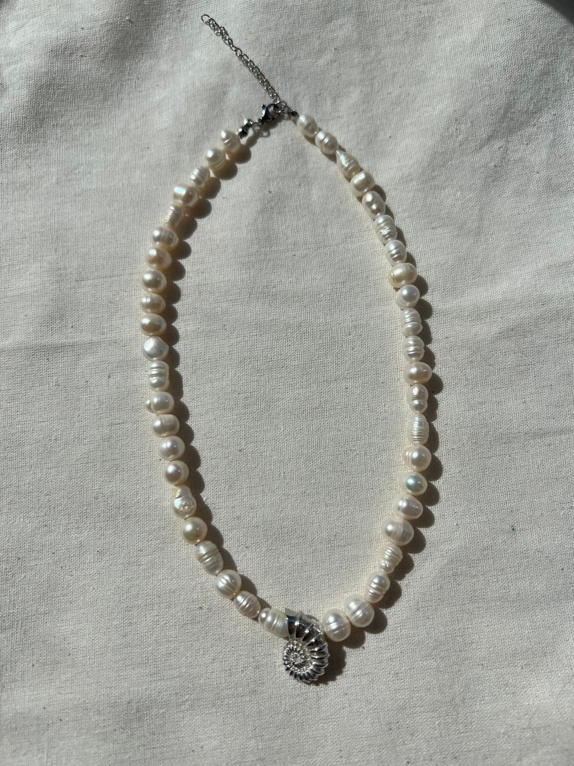 El işçiliğiyle üretilmiştir. Her inci farklı bir form ve dokuya sahip olduğu için, her kolye kendine özgüdür. Deniz kabuğu detayı 925 ayar gümüştür. Siparişinizi verdikten sonra size özel, özenle hazırlanır, 1-3 iş günü içerisinde kargoya verilir.